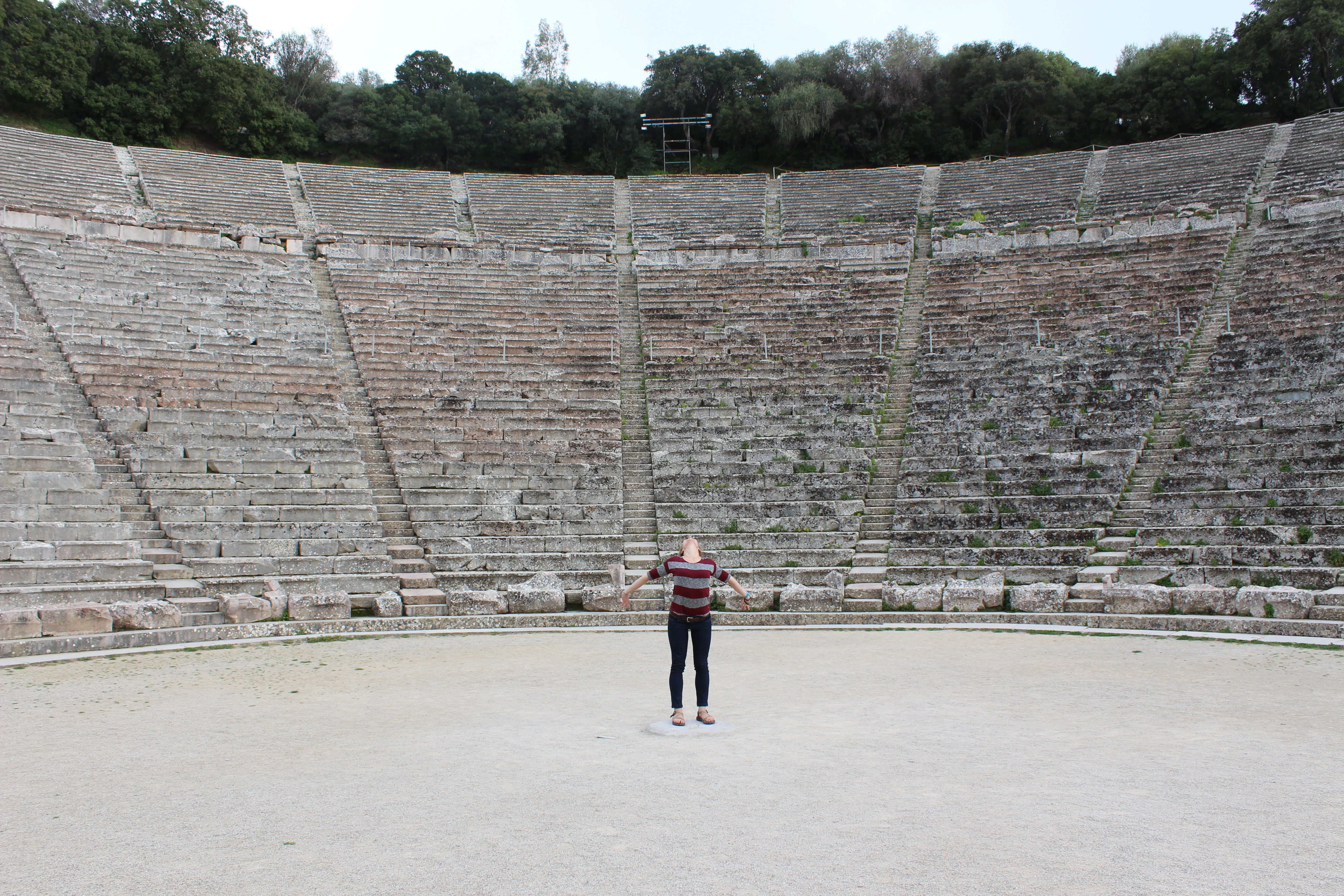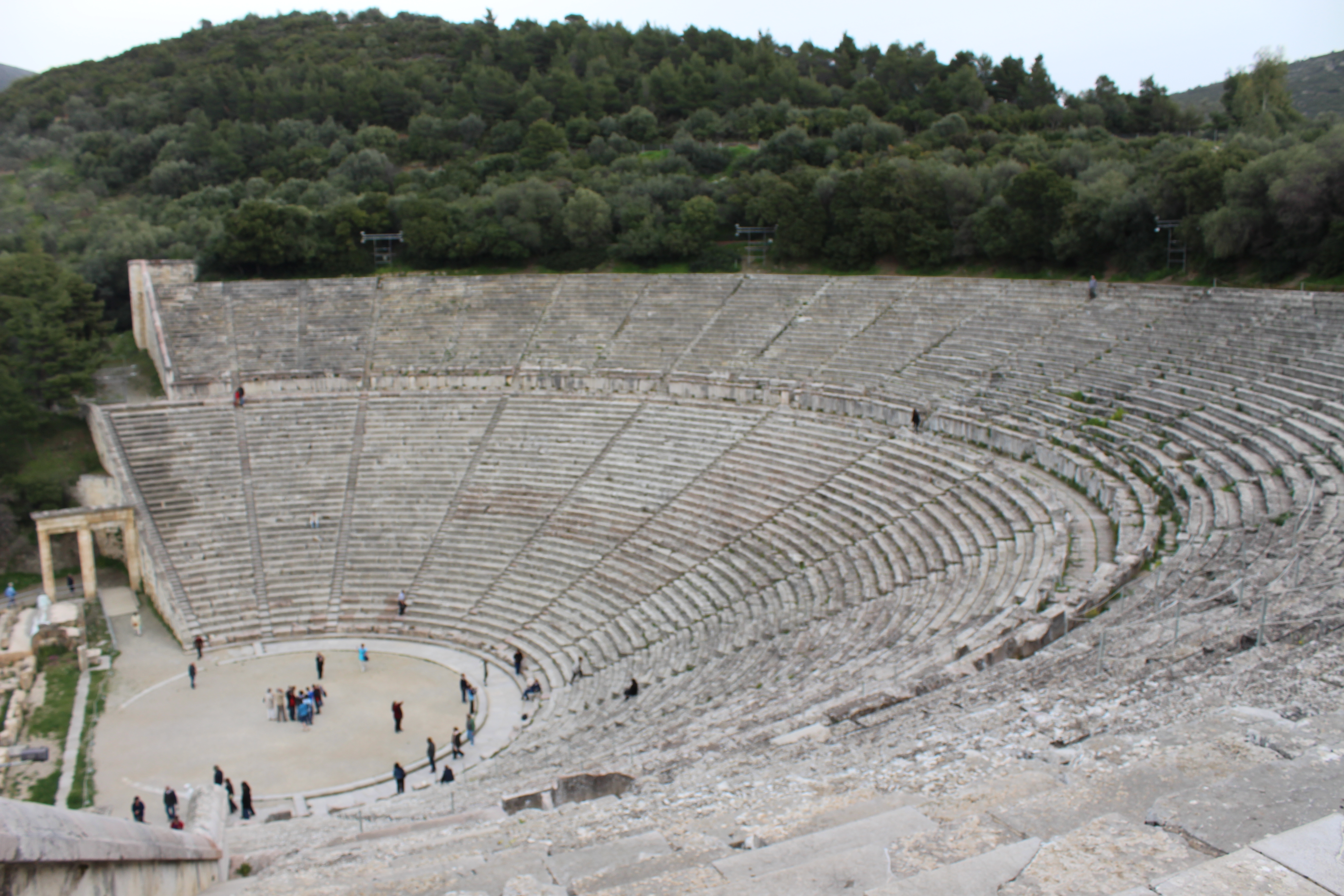 The Theatre at Epidavros.Greek inscriptions at Epidavros.An Italian tour group. The woman with the cane is an amazing opera singer, as I discovered when she suddenly burst into song.“Singing” in the theatre at Epidavros.The ubiquitous Olive Tree.