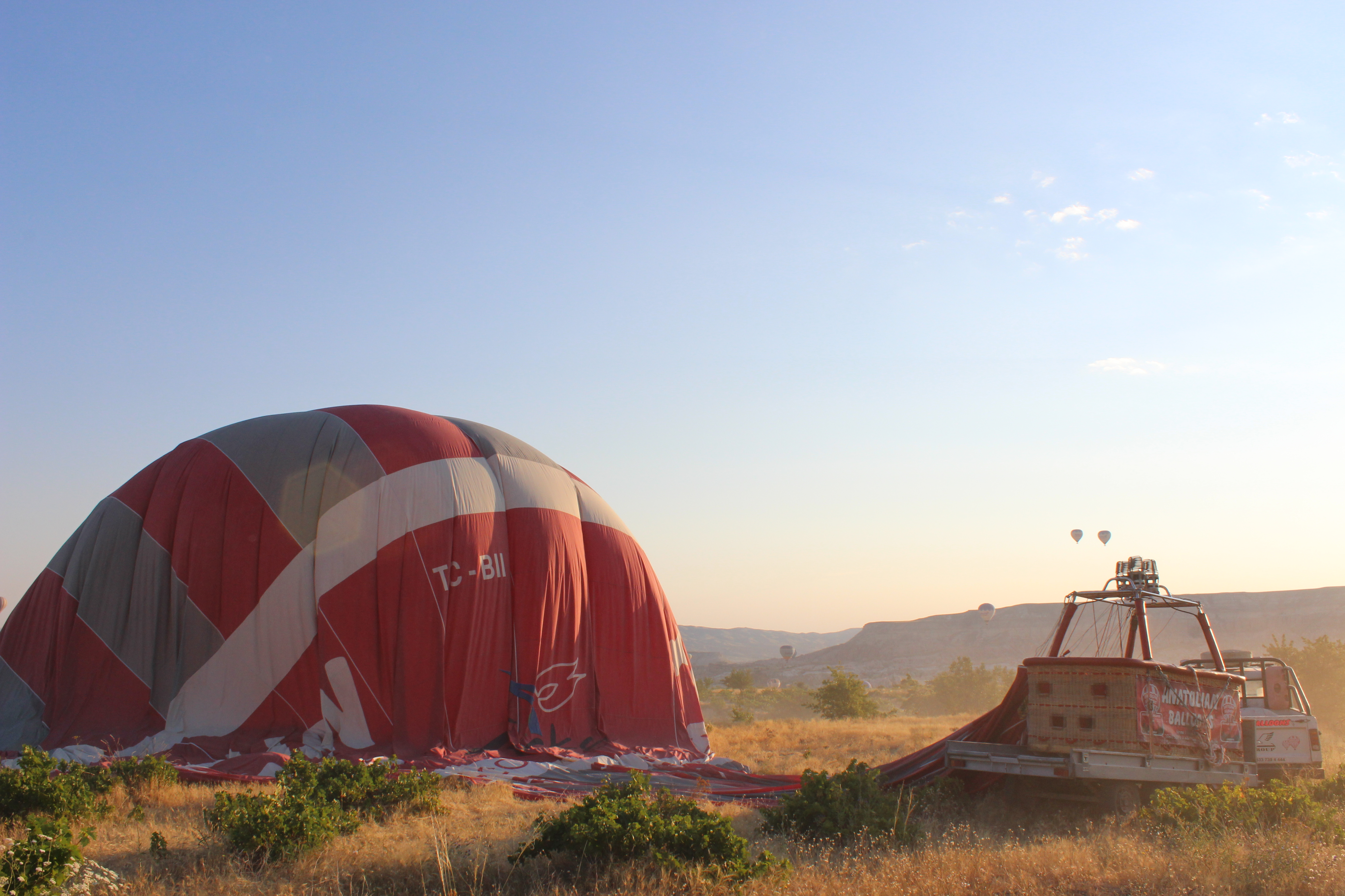 Deflating the balloon. The balloon operator landed the basket on the bed of the truck, tipped the balloon to the side, and began deflating it. Meanwhile, a truck pulled up and a bunch of Turkish men popped out. Some helped secure the basket, and others set up a rinky-dink table and poured champagne (ok, some sort of sparkling drink) for us!
