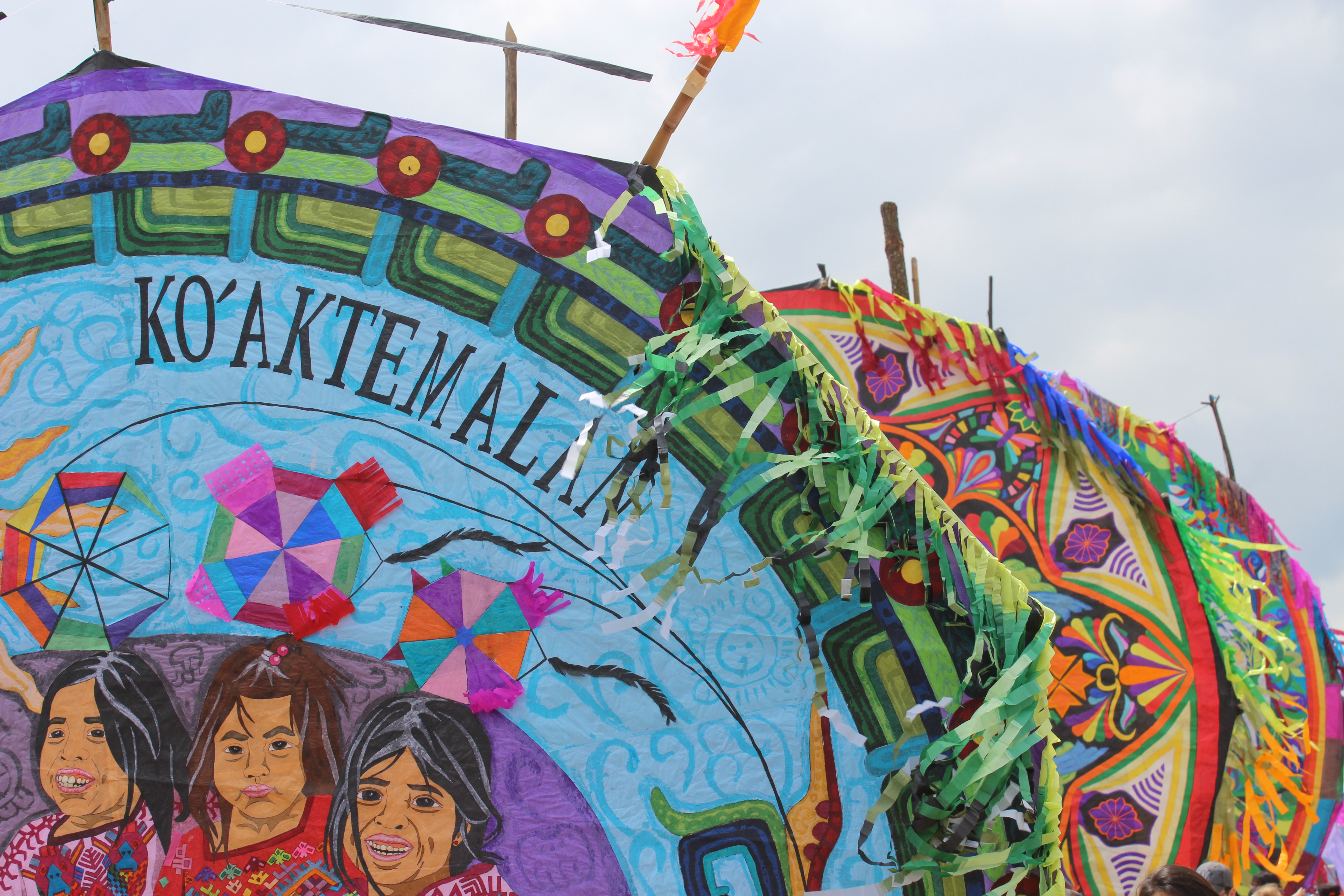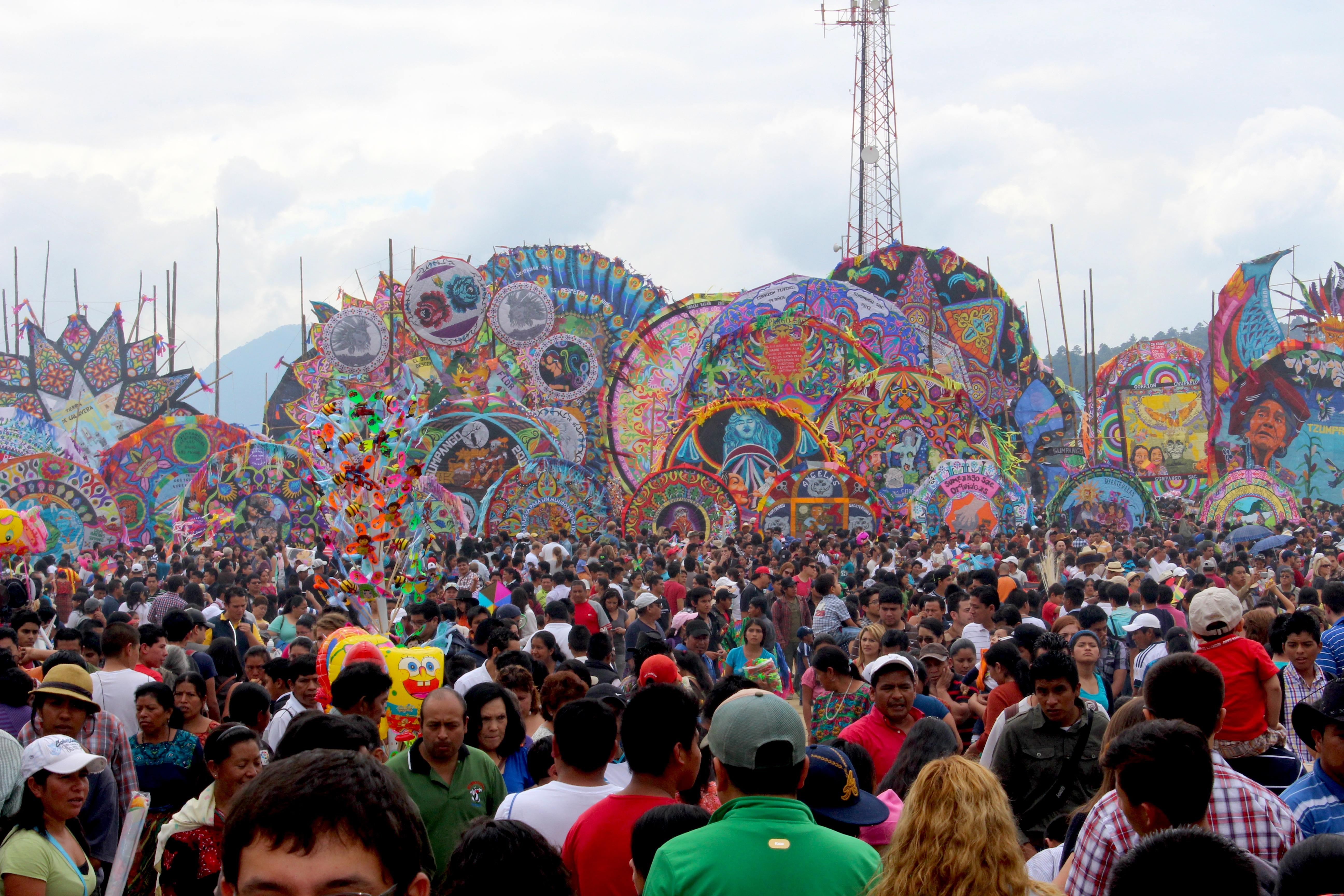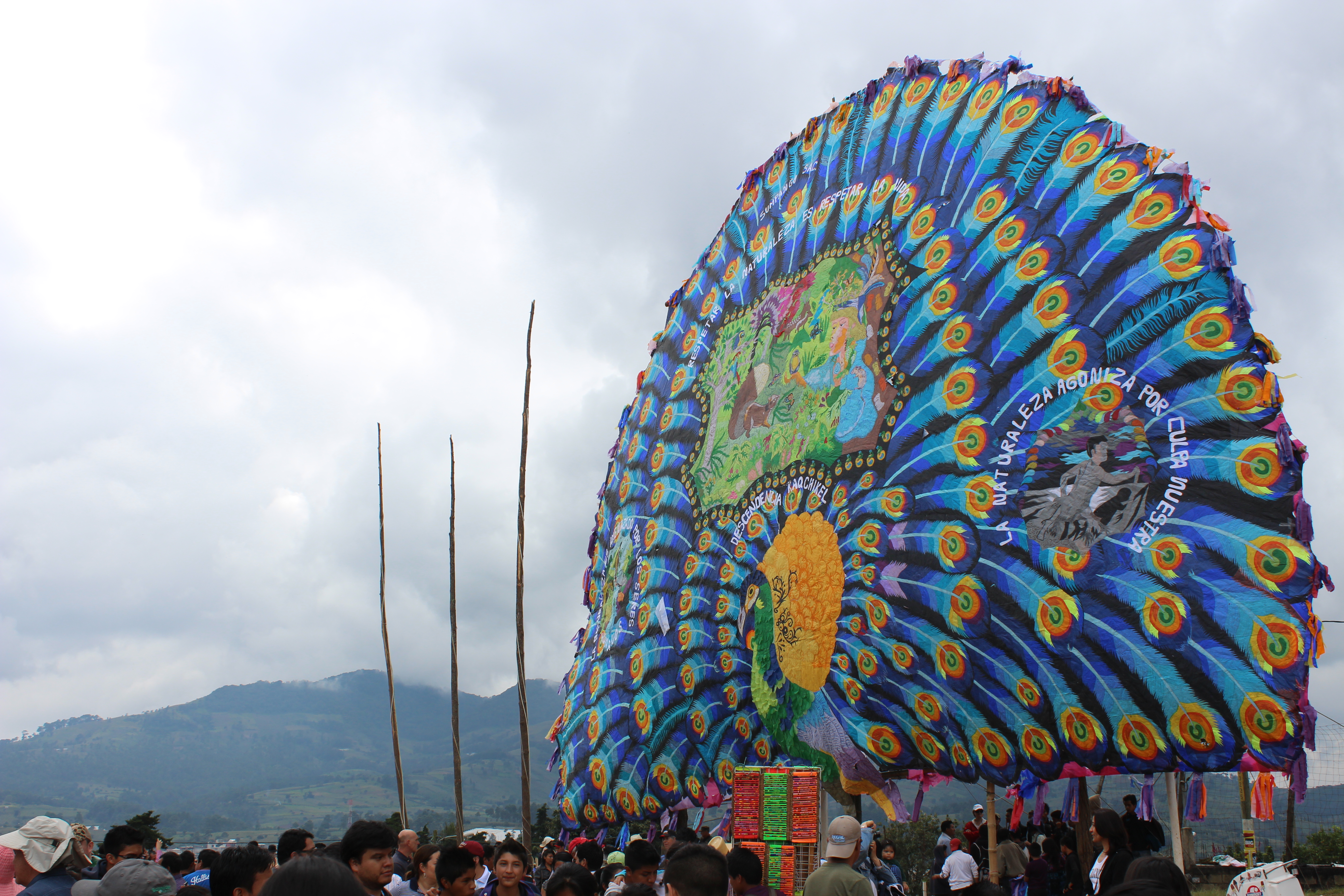 Día de Todos los Santos is also the day of the Giant Kite Festival. This festival takes place in two pueblos in Guatemala: Sumpango and Santiago, in the region of Sacatepequez. I went to Sumpango, where all the kites were poised atop a huge hill, and little kids flew small kites on the hillside overlooking the road.