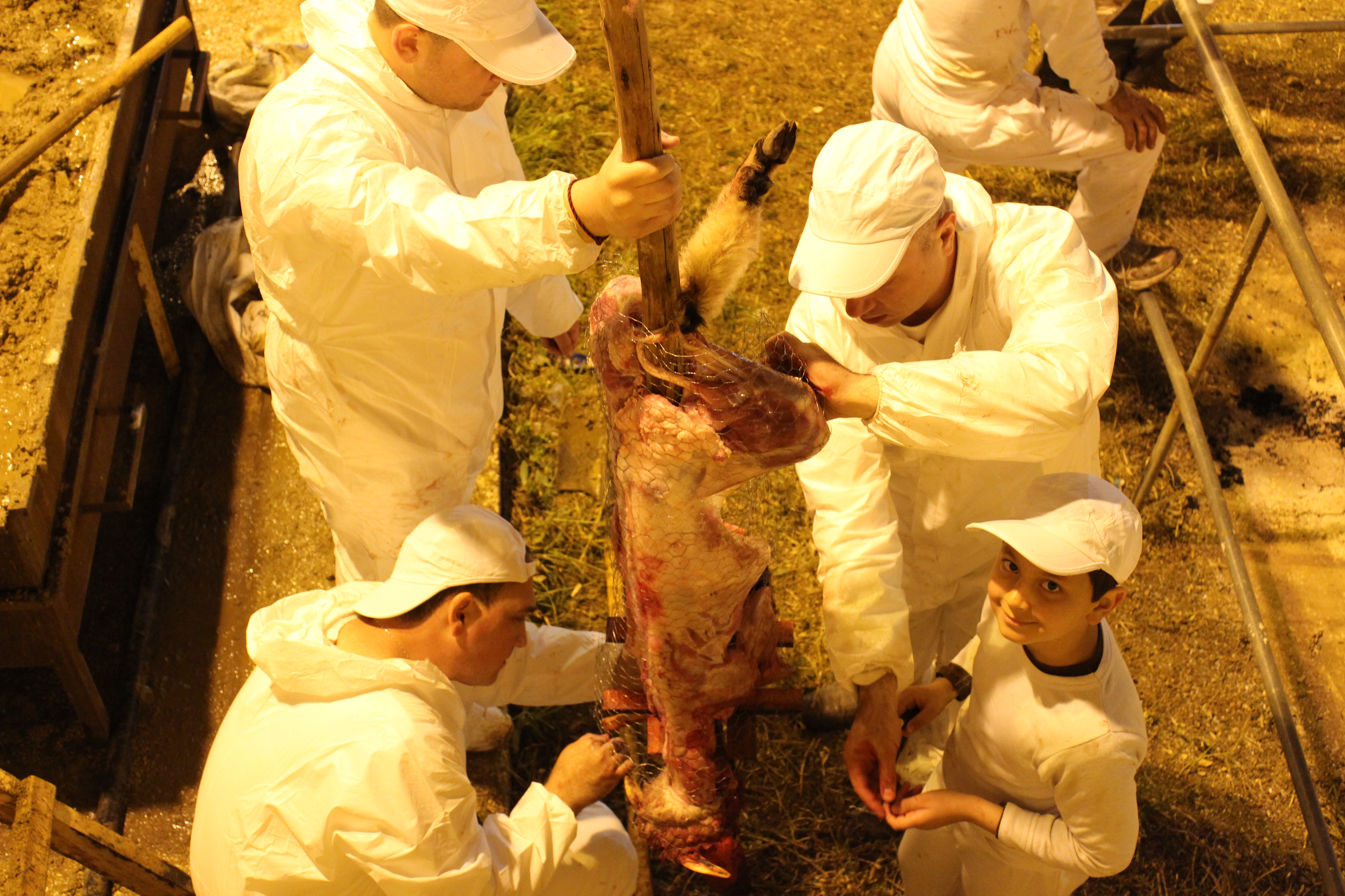 The men let the sheep’s blood drain into the trench, then hung them by their hind legs to drain the remaining blood; they then skinned the sheep, gutted them, and tied the carcasses to pointed stakes: