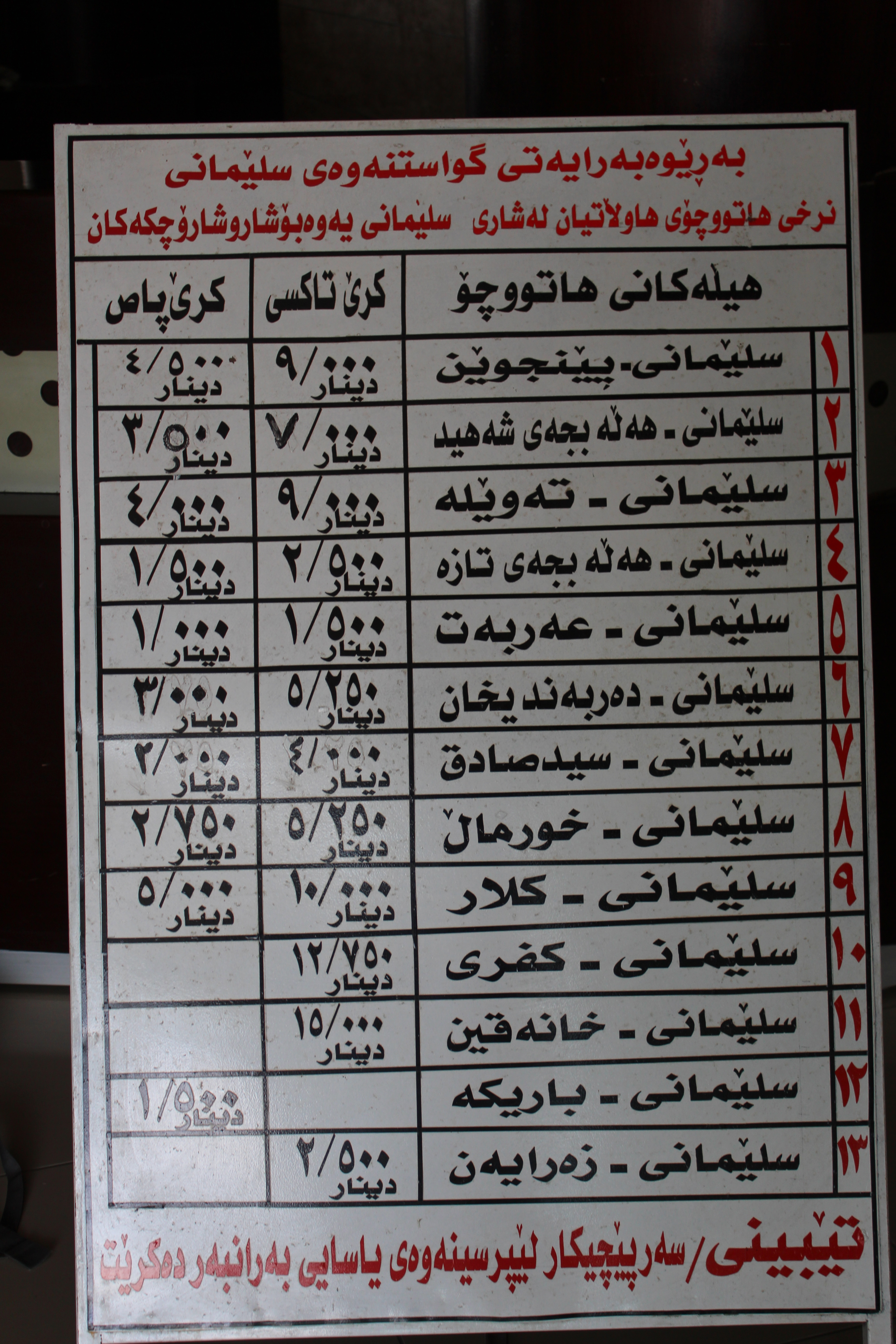 Suli <-> Halabja: 3,500 dinar (seh hezar oo nyoo dinar). About 1.5 hours.